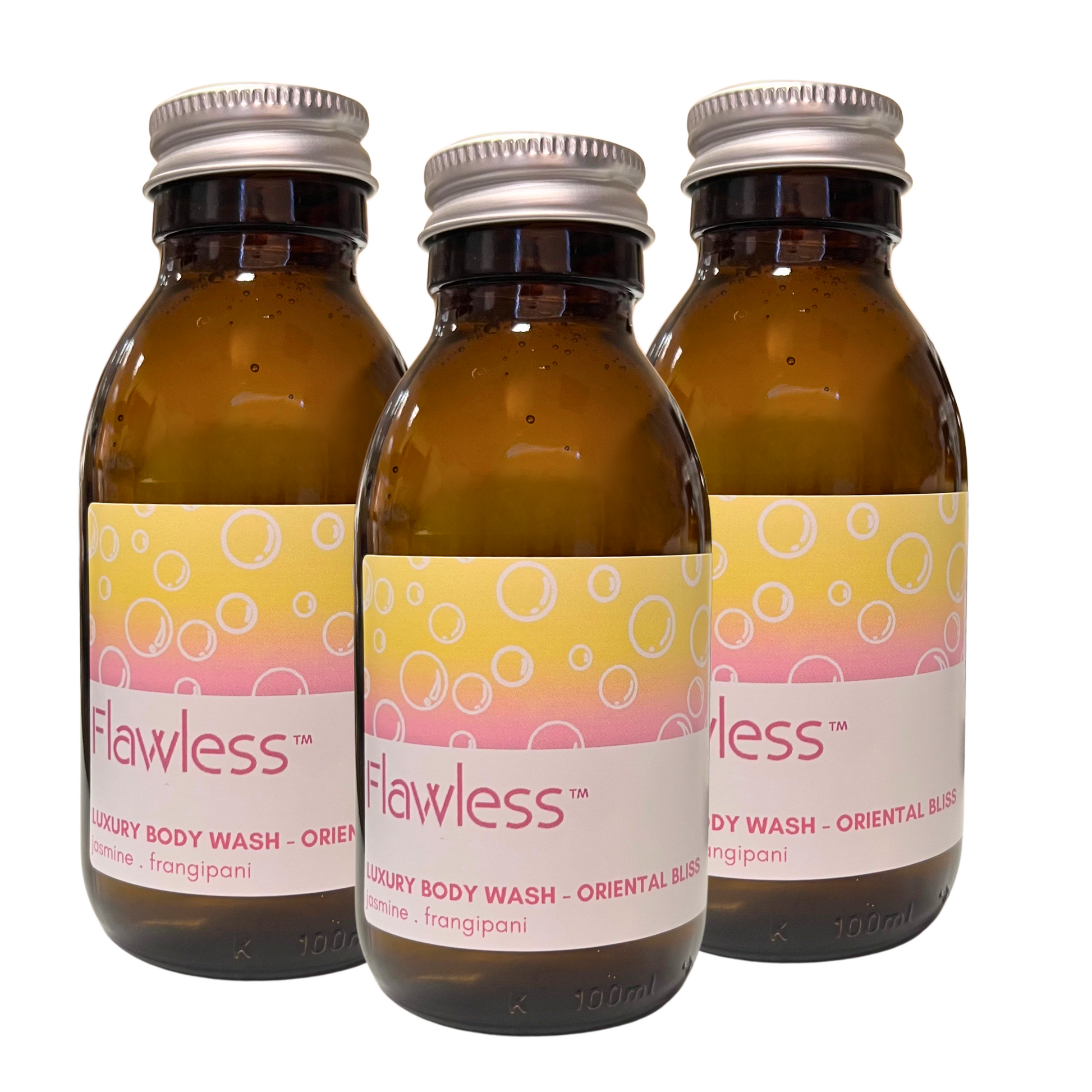 Verpackung: 50 ml und 100 ml Luxus-Duschgel werden in einer Recyclingglasflasche mit Aluminiumdeckel geliefert.